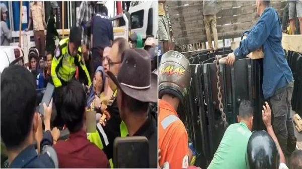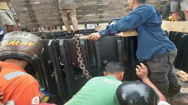 BATAM, TRIBUNBATAM.id - Teriakan minta tolong terdengar, usai insiden kecelakaan di Batam, muatan truk trailer BP 8125 DU terlepas di u-turn Jalan Yos Sudarso, depan PT Giken, Kecamatan Batu Ampar, Batam, Rabu (22/10/2025), sekira pukul 15.50 WIB.