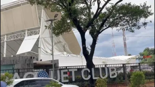 Ambruknya atas lapangan padel itu akibat angin kencang di kawasan Kembangan, Jakarta Barat, Minggu (26/10/2025).