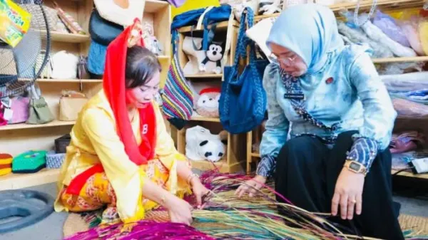 Ketua TP PKK HSU Hj Murniati Sahrujani memberikan apresiasi kepada pengrajin yang memperlihatkan cara membuat kerajinan. “Warga yang datang bisa melihat langsung proses pembuatan kerajinan yang sekaligus untuk media edukasi,” ujarnya.Banjarmasinpost.co.id/Reni Kurniawati