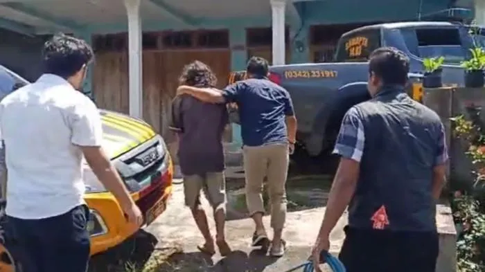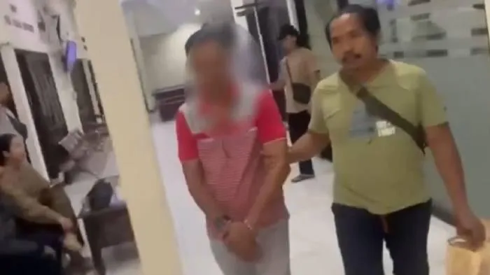 Ia nampak pasrah saat polisi memborgol kedua tangannya.