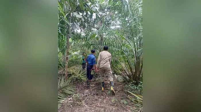 Korban ditemukan dalam kondisi tergantung di sebuah pohon yang di sekitarnya terdapat banyak pohon kelapa sawit.