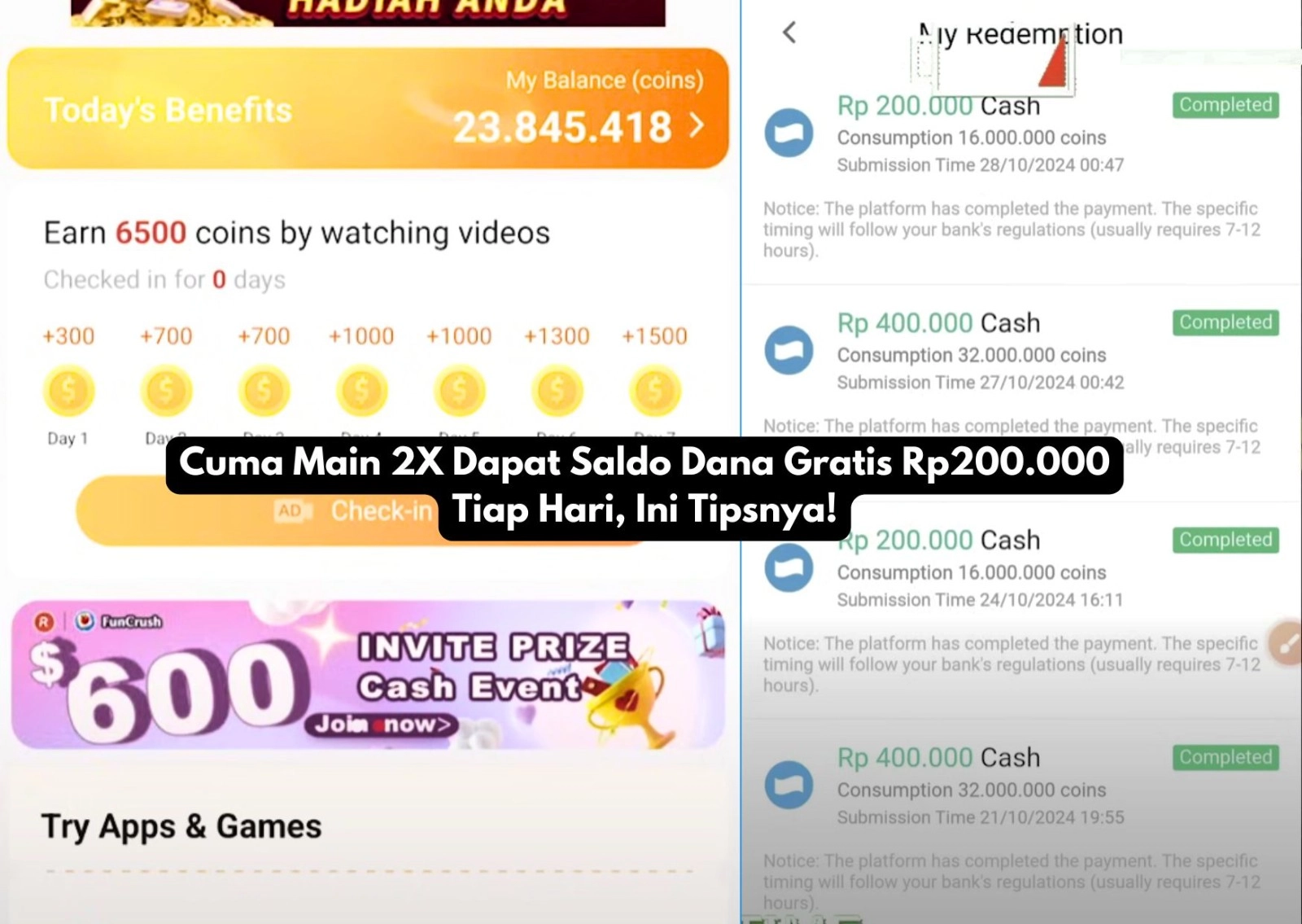 Sistem reward dirancang transparan dengan minimum withdrawal yang terjangkau dan proses pencairan cepat. Pengguna hanya perlu mengumpulkan sejumlah poin tertentu untuk mencairkan hadiah tanpa syarat rumit.