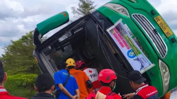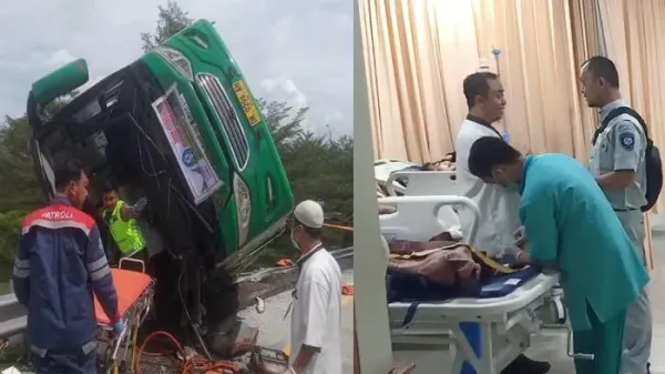 TRIBUNJATENG.COM, PEMALANG - Bangkai bus pariwisata yang mengalami kecelakaan maut di Tol Pemalang KM 312 B arah Exit Tol Gandulan pada Sabtu (25/10/2025), tampak mengalami kerusakan parah.