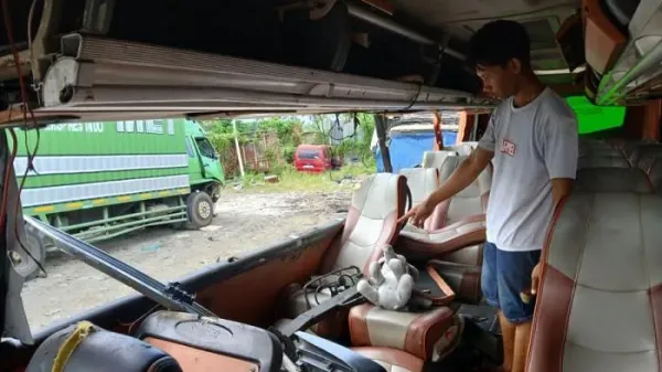 Saat memasuki bagian dalam bus, kursi penumpang di bagian depan tampak rusak hingga lepas.